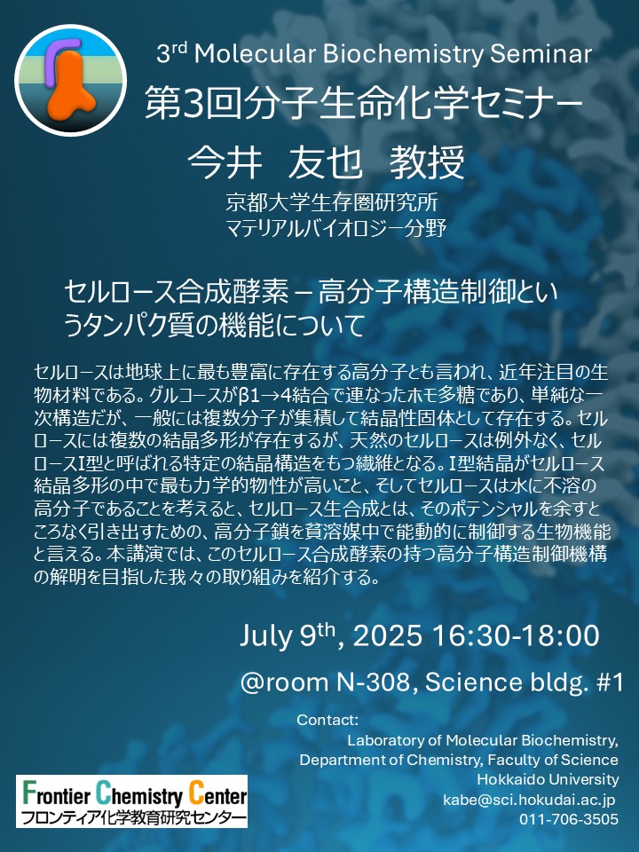 3rd Molecular Biochemistry Seminar. Lecturer : Prof. Tomoya Imai (Kyoto University) 3rd Molecular Biochemistry SeminarJuly 9th, 2025 16:30-18:00@room N-308, Science bldg. #1 Jul. 1, 2025
